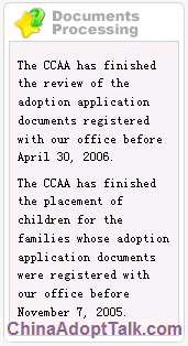 The bigger news is that the CCAA also updated the part of the box about the review room. Dossiers through March 22 are out - that means we are in review right now. I'm nervous. REALLY nervous. Our adoption coordinator just found a typo on our INS approval (don't even get me started...), and I am working right now to get it fixed. Since it is highly unlikely we will even be able to travel on this approval (fingerprints are only good for 12 months; the approval is only good for 18 months), we will have to go through the process again anyways. (Not only will we have to do all the paperwork again, it will cost us approx. $1000 to file all of it. If you want something to do, write to your congressman to support a bill that was recently proposed to extend how long the I171-H, the approval form, is good for) But I am worried that they will want a corrected form before we can get through review. The real problem is that this could set us back a month or two in receiving our referral. There's no way to say for sure it would happen, but even the possibility is making me sick to my stomach. Here's hoping that the CCAA misses the typo too, or understands that it doesn't really matter.