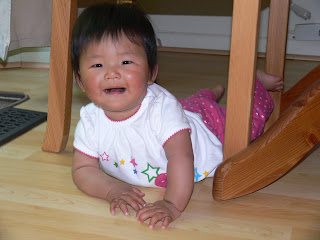 It's hard to believe that one month ago we were in China, just having met Hannah. It's still sort of surreal - even after a month, it's hard to believe sometimes that she is all ours. It's amazing to look at the pictures from a month ago and realize just how far she has come in a month. When we got her, she couldn't sit up on her own, couldn't feed herself, couldn't reach her own toes, and couldn't fall asleep unless we sang to her and sat with her. Today she can sit up on her own - in fact, she is sitting up and enjoying Sesame Street with us right now (no real surprise that she loves it, considering how much Mommy & Daddy love Sesame Street, or that she is fascinated by Cookie Monster, considering how she eats!). She can also roll anywhere she wants (and VERY quickly...Mommy looked down for a moment yesterday and all of a sudden Hannah was under the dining room table!), and is very close to crawling - she gets herself up on one knee and rocks back and forth. Hannah still loves food, and can now feed herself (and is getting much better with the accuracy - she likes to grab food and just smush it against her face!). She is getting better with the sleeping, and likes to listen to her CDs while she talks to her taggie blanket as she falls asleep. She amazes us every day.